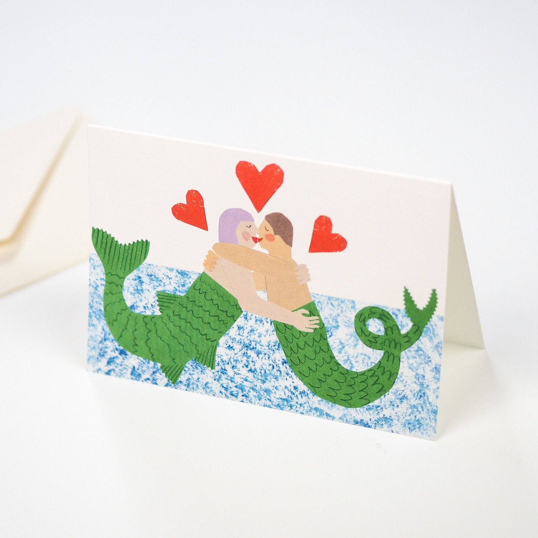 An illustrated greeting card featuring two merpeople in a tender embrace. A celebration of love, friendship and sea-soaked magic, this romantic design is printed on premium 300gsm eco-friendly card and left blank inside for your own heartfelt words. Finished with an ivory envelope.