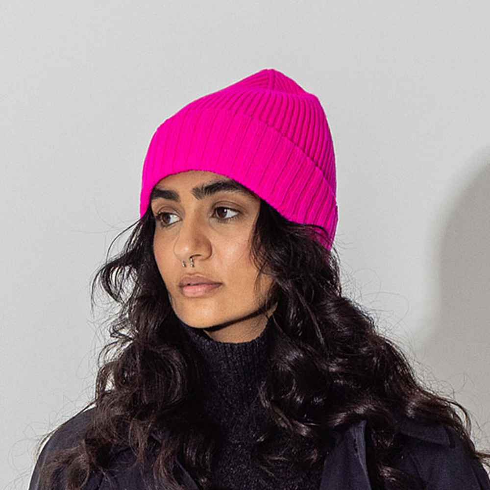 COMING SOON! A vibrant fluro pink ribbed beanie in cashmere–merino. Knitted in Scotland with natural stretch, softness, and insulating warmth.