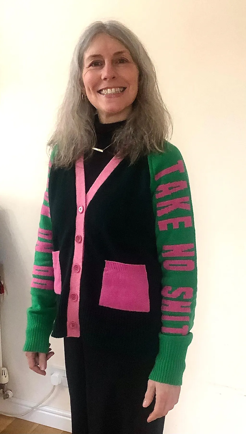 Do No Harm Take No Shit Lambswool Cardigan in Kelly Green & Bubblegum