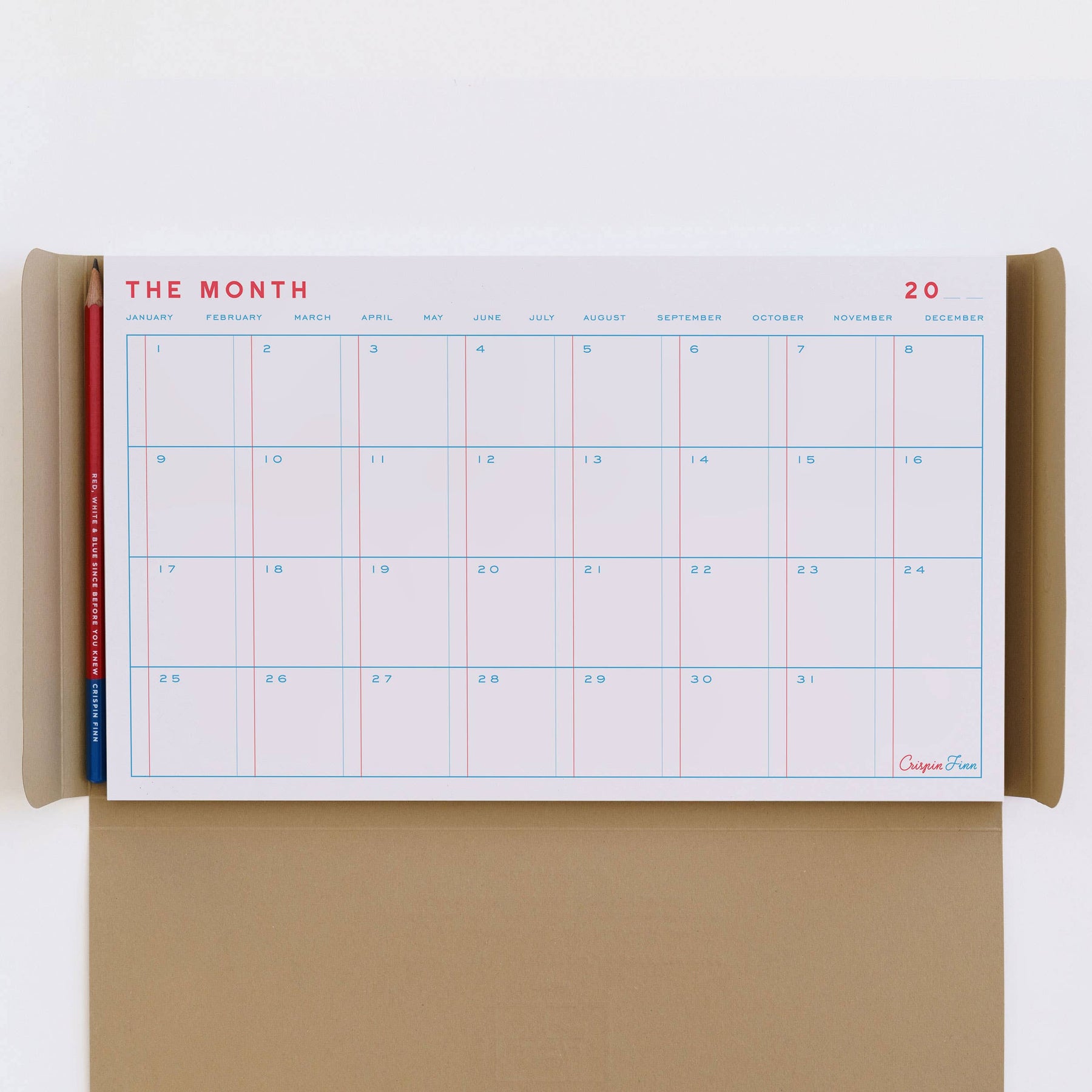 Organise the month ahead with The Month Pad. Clear grid with large boxes to plan and annotate each day, and flexible to use for any month. 50 litho printed tearaway 120gsm paper sheets on backing board with custom Crispin Finn pencil included. 100% recycled and presented plastic-free in printed card packaging. –Measures 29.7cm x 17cm –Lithographically printed –120gsm 100% recycled paper –Packaged in custom kraft packaging with a cedar wood Crispin Finn pencil. –Made in the UK
